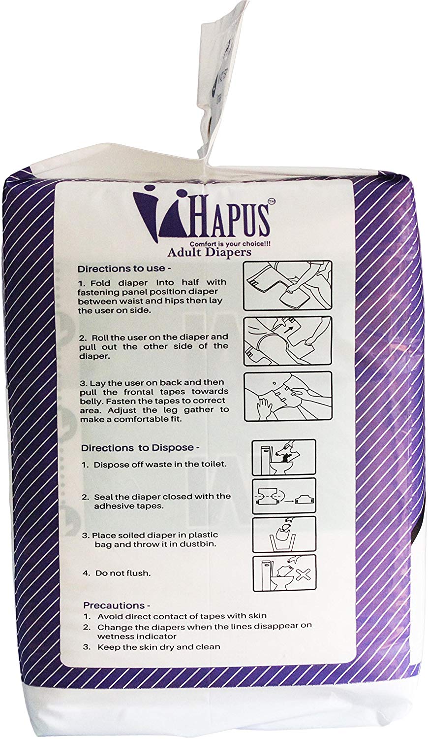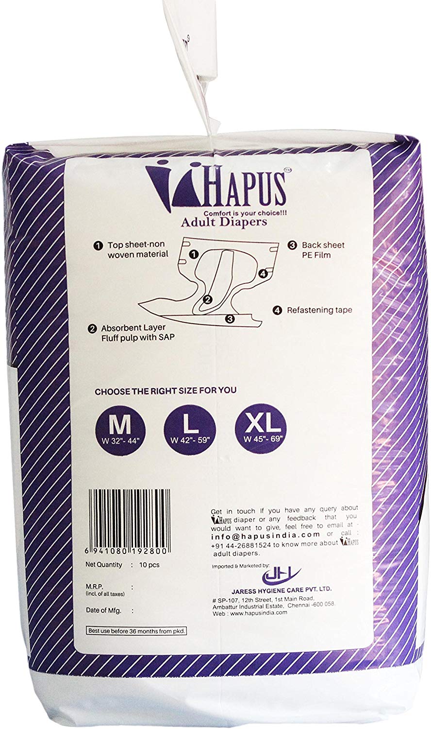 Hapus Adult Diapers Economy - Large (L), 10s Pack, (106cm - 149cm) (42" - 59") * Cottony Soft and Comfortable * Widest Absorbent Area for optimum comfort * New improved German SAP for advanced leakage protection * Extra Fluff Pulp for superior fluid retention * Wetness Indicator
